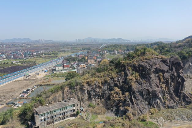 蕭山區(qū)義橋鎮(zhèn)四姑灣礦區(qū)廢棄(關(guān)停)礦山位于蕭山區(qū)與富陽區(qū)交界處,義橋鎮(zhèn)富春村南面,石門水庫西側(cè),緊鄰春永線。該礦山于2015年關(guān)停。礦區(qū)南側(cè)高程+145m以上邊坡已完成治理綠化,部分坡面區(qū)域基巖裸露,坡面受節(jié)理裂隙相互切割影響和風(fēng)化侵蝕剝蝕作用,局部存在小規(guī)模的掉塊、崩塌等現(xiàn)象;礦區(qū)其余段開挖邊坡由于該礦山不規(guī)則開采,造成礦山遺留邊坡呈高陡邊坡,組成邊坡基巖裸露,邊坡面凹凸不平,局部存在危巖體,存在崩塌隱患;且邊坡坡頂處有大量的堆積土,結(jié)構(gòu)松散,部分堆土表面已出現(xiàn)裂縫,存在滑塌隱患;區(qū)內(nèi)約+30m高程以上部分均為可視范圍,造成較大的視覺污染。
