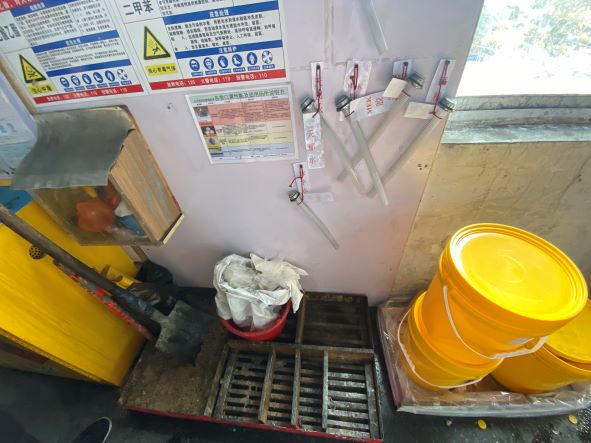 浙江宏竹塑膠五金有限公司生產(chǎn)過程中涉及的危險化學(xué)品主要分溶劑類、膠粘劑類和液體噴劑類。溶劑類危險化學(xué)品分別為油墨、天那水、乙醇、抹字水、洗網(wǎng)水、稀釋劑、PP水,主要使用于產(chǎn)品裝配時表面擦拭、印刷產(chǎn)品、網(wǎng)版擦拭及油墨稀釋。膠粘劑類危險化學(xué)品分別為MEK膠水、萬能膠、AB膠,主要使用于產(chǎn)品裝配時的塑膠軟管粘接、塑膠硬管粘接及金屬管與塑膠管粘接。液體噴劑類危險化學(xué)品分別為脫模劑、防銹劑、清洗劑、防卡耐磨劑,主要使用于模具保養(yǎng)、機械保養(yǎng)。危險化學(xué)品儲存場所為二號車間西北角的危險化學(xué)品中間倉庫。